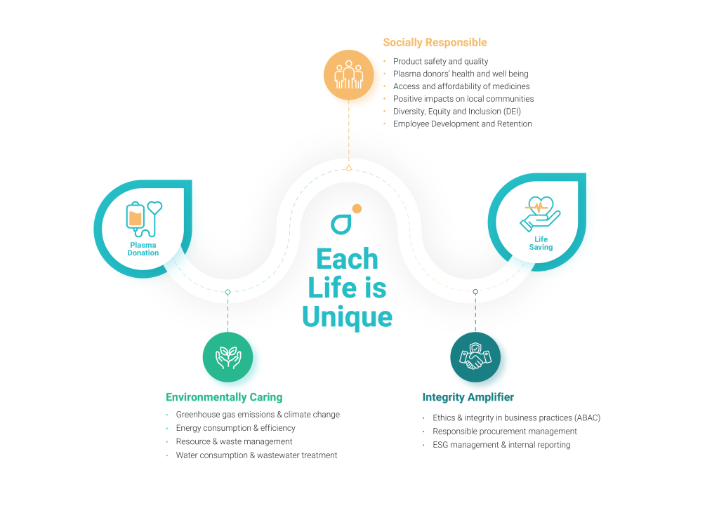 Our sustainability journey follows a direct and meaningful path – beginning with the donation of human plasma and culminating in the delivery of life-saving therapies. Every step along this path embodies our core belief that ‘Each Life is Unique‘. From ensuring the safety and wellbeing of our plasma donors, to innovating therapies that meet urgent and unmet medical needs, we strive to make a positive difference for patients and communities around the world.